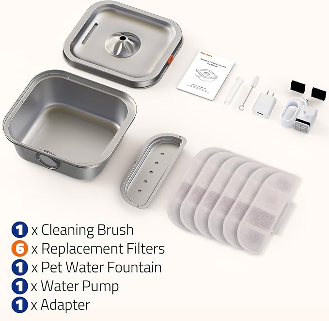 - [Ultra-Quiet Water Pump] The pet water fountain is equipped with an ultra-quiet water pump, producing noise levels below 30 dB during operation. This ensures that your pet won't be startled while drinking and won't disturb your daily activities.