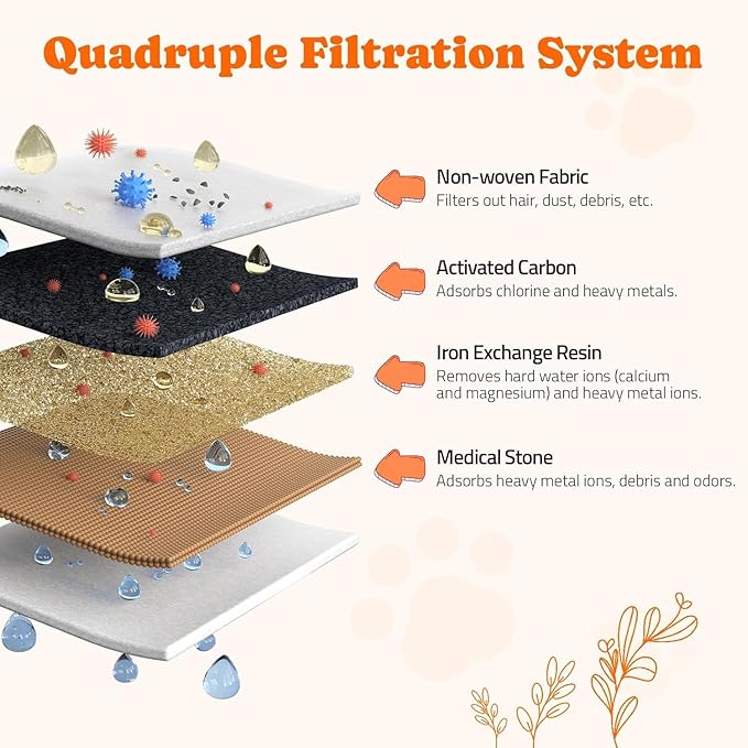 - [Quadruple Filtration System] The automatic dog drinking dispenser is equipped with an activated carbon filter, which can remove odors and soften water quality. The filter captures pet hair, dirt, and food particles, providing fresh water for your pet all day long.