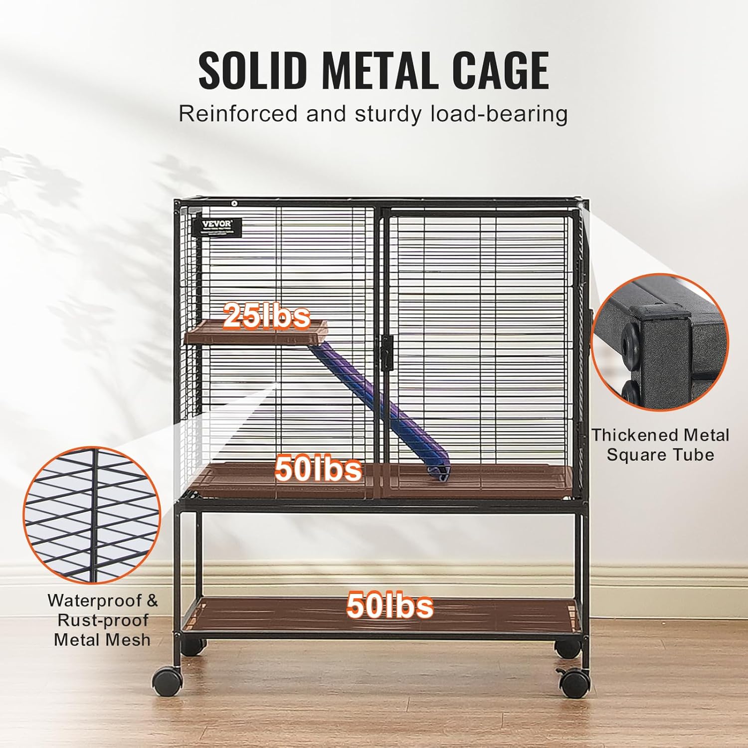 - Easy to Clean: The removable platforms and grids make the small ferret cage cleaning easy. The ABS-coated metal bottom tray fits tightly with the metal mesh to prevent urine leakage and foot injuries, providing a safe environment.Vevor ferret nation cage with the pull-out design and openable front door facilitate quick and convenient cleaning.