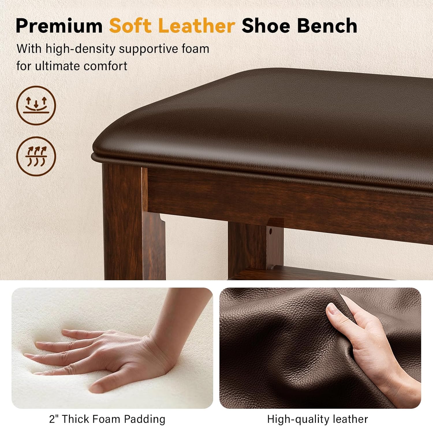 - ELEGANT RUBBERWOOD CONSTRUCTION & LUXURY LEATHER CUSHION: This shoe bench features a sturdy design that comfortably supports a person's weight, thanks to its solid wood construction. It’s robust enough for multiple people to put on or take off their shoes at the door. The plush leather cushion creates a cozy spot for slipping on or removing shoes, with generous padding for a quick sit or a moment of relaxation.