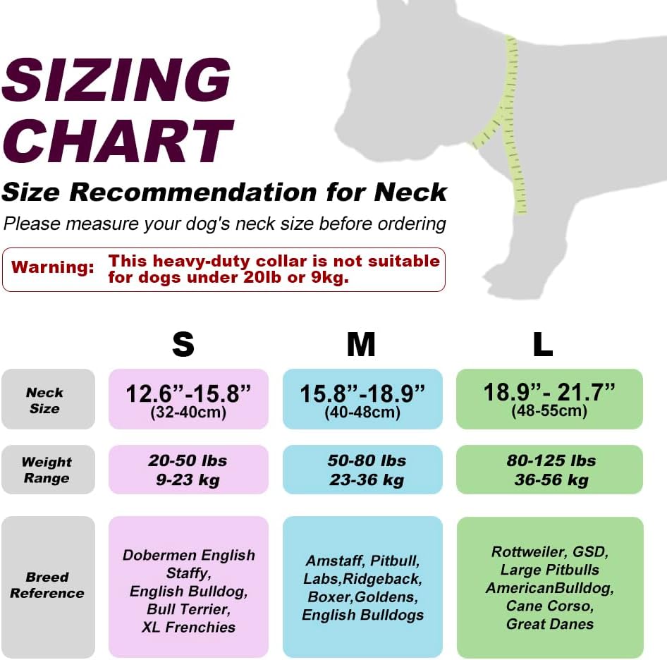 - Metal Collar for Dogs: The dog collars for medium dogs and large dogs with 4 adjustable points, easy to adjust the comfortable fit and attach to dog leash or dog collar. Please follow the size chart to measure your dog carefully before purchasing to ensure the halloween collar for dogs or christmas collar for dogs are fit well to your dog. For dog neck (L: 18.9”-21.7”, M: 15.8”-18.9”, S: 12.6”-15.8”)