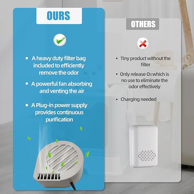- 🍃𝗛𝗲𝗮𝘃𝘆 𝗗𝘂𝘁𝘆 𝗙𝗶𝗹𝘁𝗲𝗿 𝗣𝗮𝗰𝗸 - Not a cheap weak battery operated ozone generator, our cat litter air filter is equipped with a 1-inch thick filtration media, a mixture of Activated Carbon, Negative-ion Nano Carbon Balls, and Ammonia Removal Particles, without ozone and fragrance, which effectively eliminate odor from cat litter, pet dander, smoke or pollen.