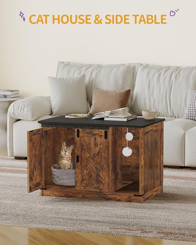 Cat Litter Box Enclosure, Hidden Litter Box Cabinet Furniture with Bell, Indoor Cat House, Farmhouse Style, 31.5 x 19.7 x 20.9Inches, for Hallway, Bedroom, Rustic Brown and Black CB82401X