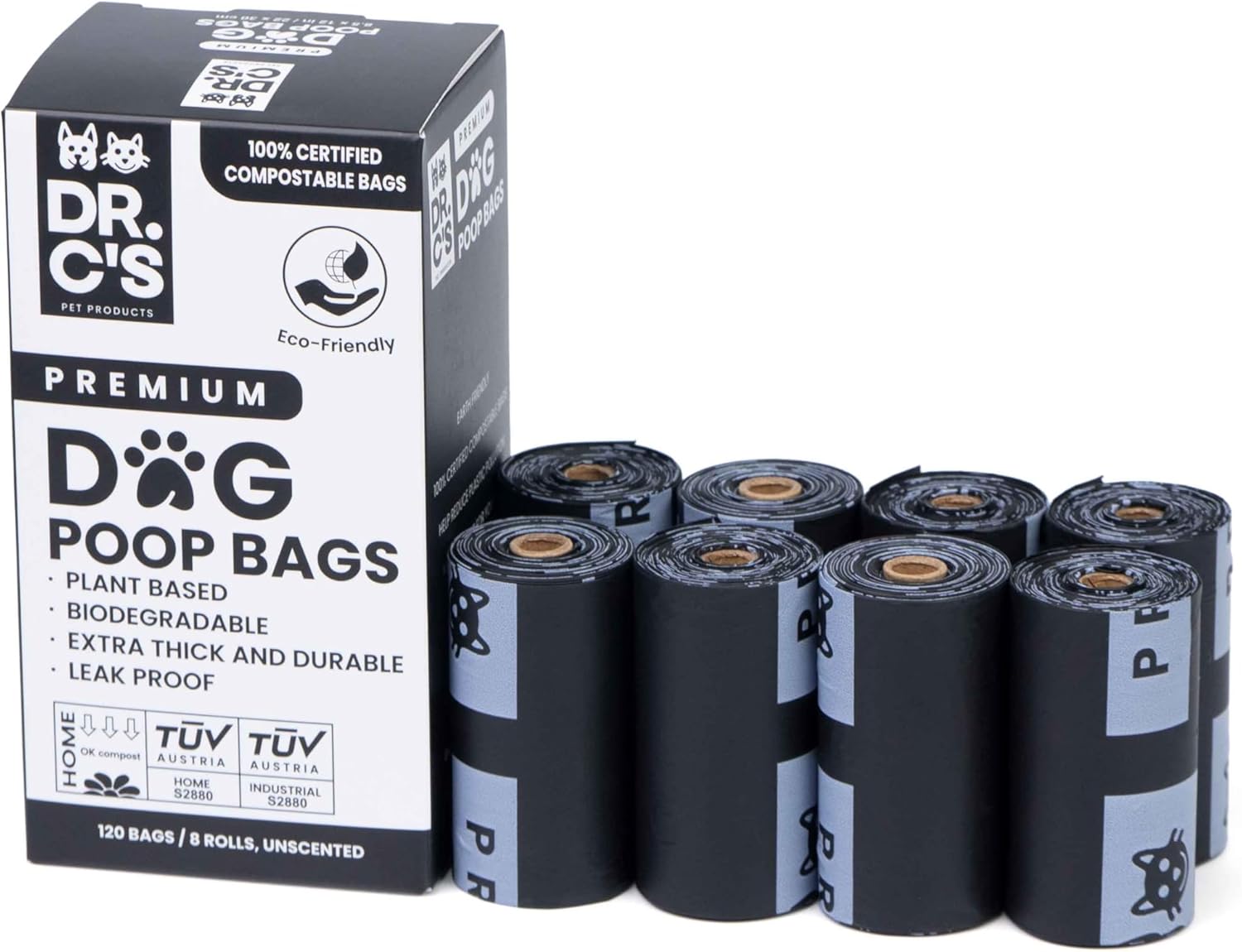 100% Certified Compostable Dog Poop Bags - Dr. C's Premium Dog Poop Bags - 120 Bags / 8 Rolls, Extra thick, Leak Proof, Unscented, Plant Based and Earth Friendly