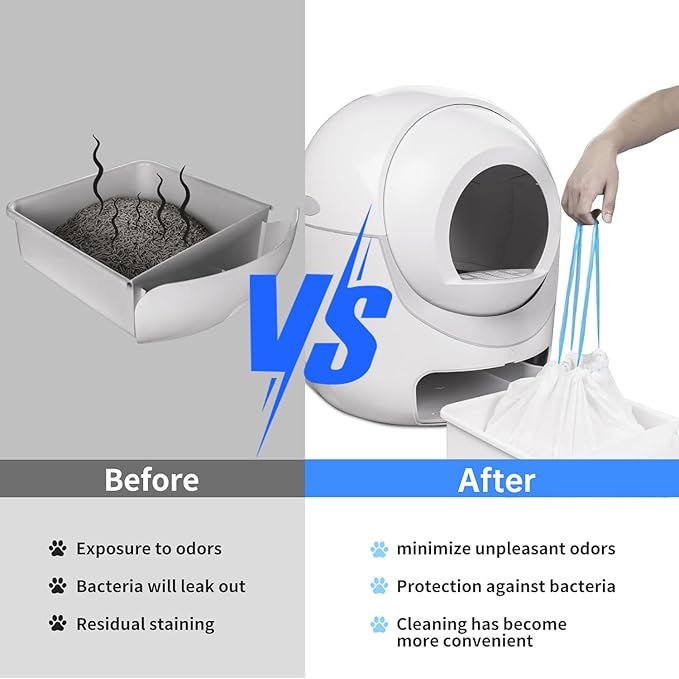 - [LARGE CAPACITY & VERSATILE]The cat litter box bag liners can hold up to 22 pounds of litter, which is enough to hold the weight of daily cat litter and waste, perfect for multi-cat households and busy cat owners. The cat litter bag is not only compatible with the self cleaning robot 2/3/4 but also fits the 5.5-gallon trash can. So it can also be used for kitchen and household garbage bags