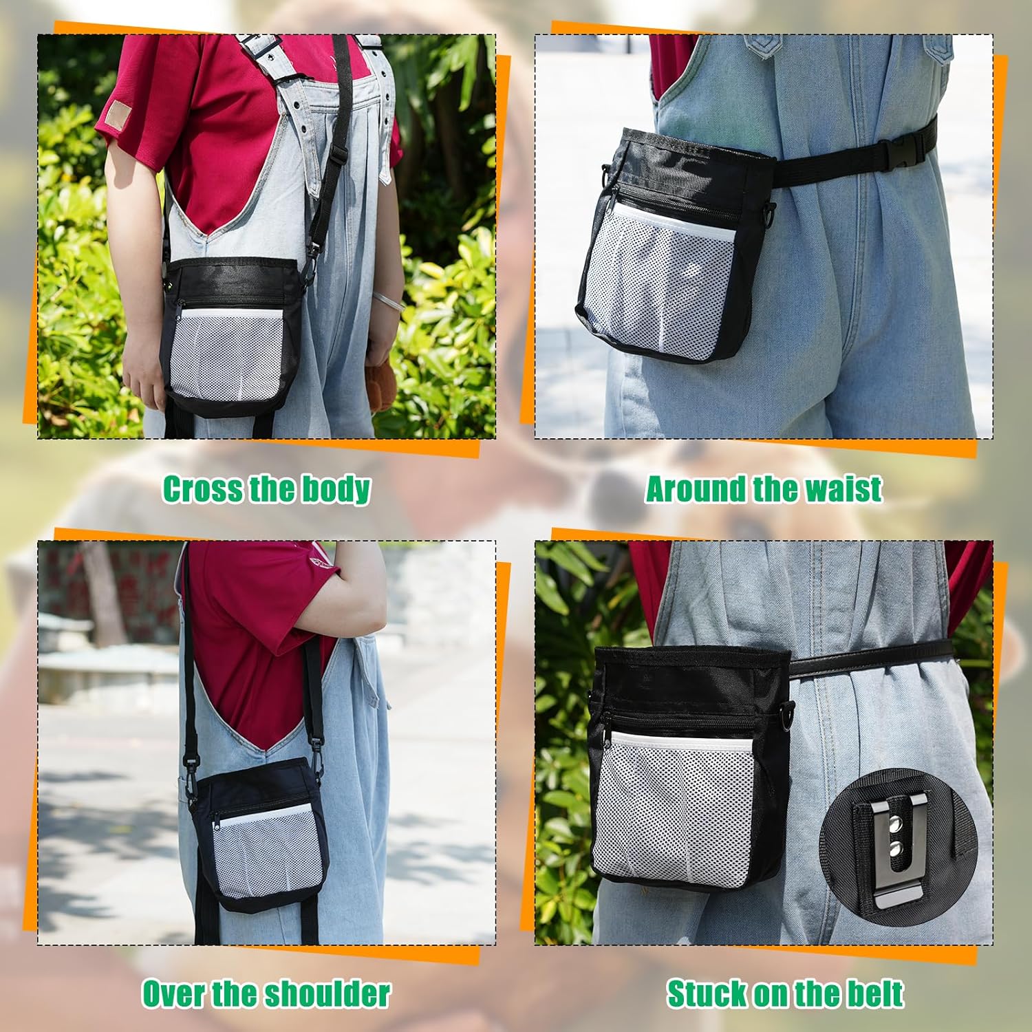 - Multiple Ways to Wear: There are several methods to wear a dog training treat pouch. You can tie it around your waist with an adjustable belt, slung it over your shoulder, or attach it to your belt with a metal belt clip