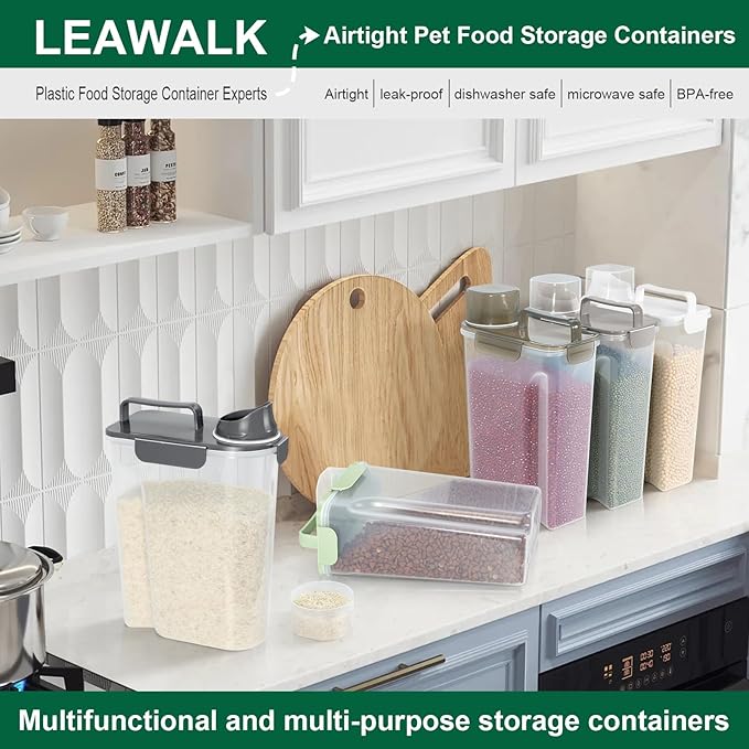 - MULTI-PUrRPOSE STORAGE:Our pet food container is suitable for storing dog food、cat food、bird seed、fish food、rice、 dry food、cereals、oats、cat litter 、flour and other large and small grains, as well as washing powder used at home. It is also a good choice.