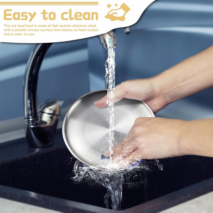 - 304 Stainless Steel Cat Dishes: Shallow cat dishes are made of premium stainless steel, each cat dish 125g,which heavy weight, ensure the cat bowl has a longer life cycle