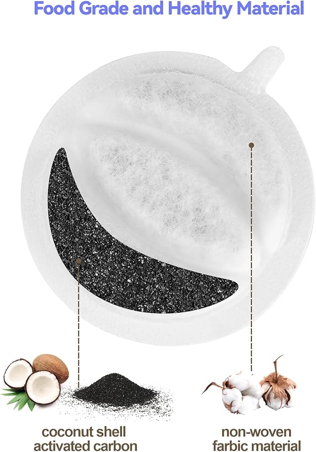 - Food Grade Cat Water Fountain Filters: SIBAYS dog water fountain filters are made of all food grade material. The superior PP cotton layer is durable and longer-lasting that stay intact after use in water for 10 days, instead of coming apart when to replace it. Natural coconut shell activated carbon tightly sealed inside won't penetrate through the PP cotton, no carbon particles evident in water.