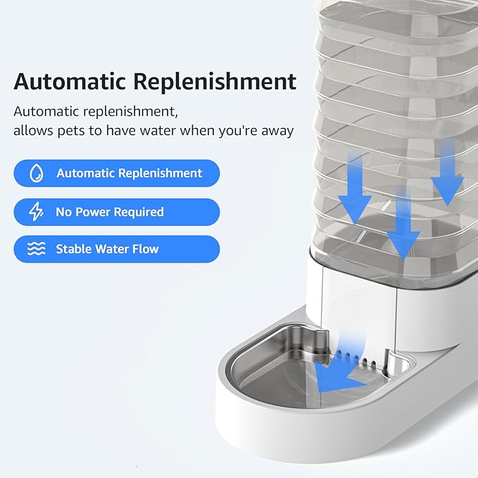 - 【Fresh - Continuous Flowing Water】With a self-gravity feeding design, the automatic dog waterer delivers a continuous flow of fresh water, eliminating the risk of your pet running out of water when you’re unable to refill their bowl.