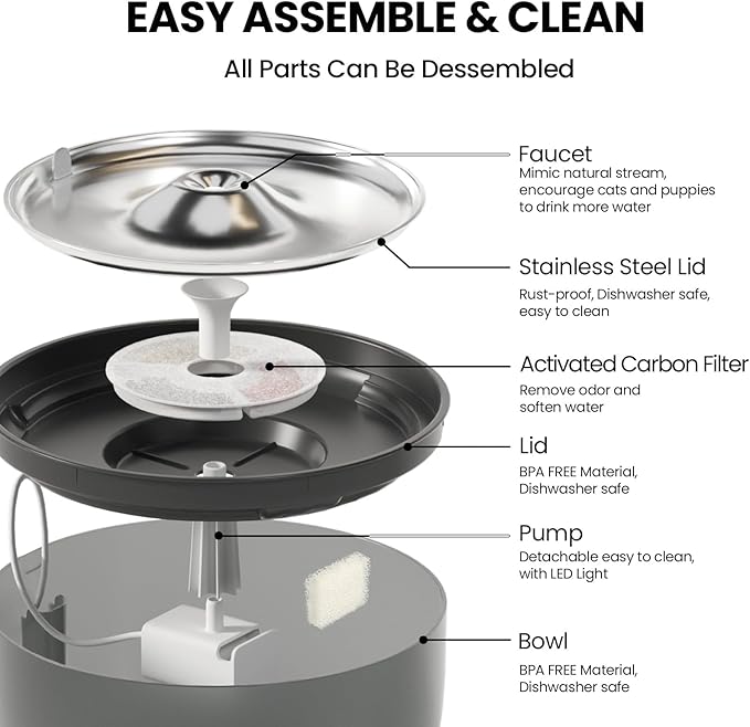 - Large Capacity & Easy to Assemble: With a 101.4oz/3L capacity, this cat water bowl provides enough water for pets for 7–10 days. Every part of the water dispenser is easily detachable, making it ideal for busy pet owners and households with multiple pets both dogs and cats