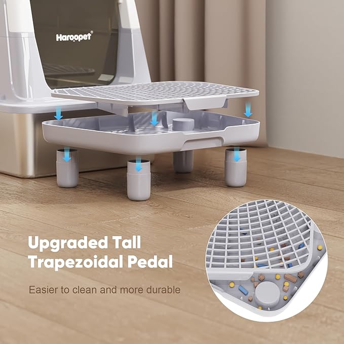 - 🐈High foot pedal design: Our metal litter box is equipped with a uniquely designed foot pedal with four high feet, which is high off the ground to prevent water accumulation. It is removable and easy to clean, and the striped grid collects fallen sand better.