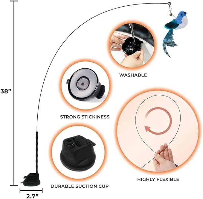 - DURABLE & ADAPTABLE: The interactive bird cat toy includes 2 highly flexible rods, a strong suction cup that can be attached horizontally or vertically to any smooth, clean surface, and a heavy-duty weighted base for carpets & furniture. The best part is that it requires no interaction from you, and your cat can play whenever they want.