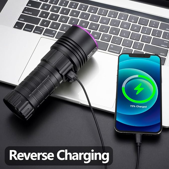 - 【Reverse Charging】This 365nm UV flashlight supports reverse charging, and thanks to its included high-capacity battery, you can rest assured to use it as an improvised power bank to charge your devices on the go. The reverse charging output port is USB A port