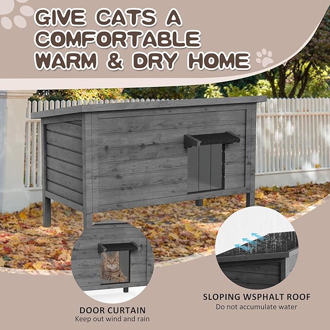- 「VERSATILE PLACEMENT」Grey cat house can be placed outdoors, offering a reliable shelter that protects your cats from wind and rain. Choose a sloped or covered area like steps, eaves, or other structures for optimal placement. 34.4 x 18.5 x 27.2 in(L x W x H), ideal outdoor cat house for cats, puppies, rabbits and other small animals.