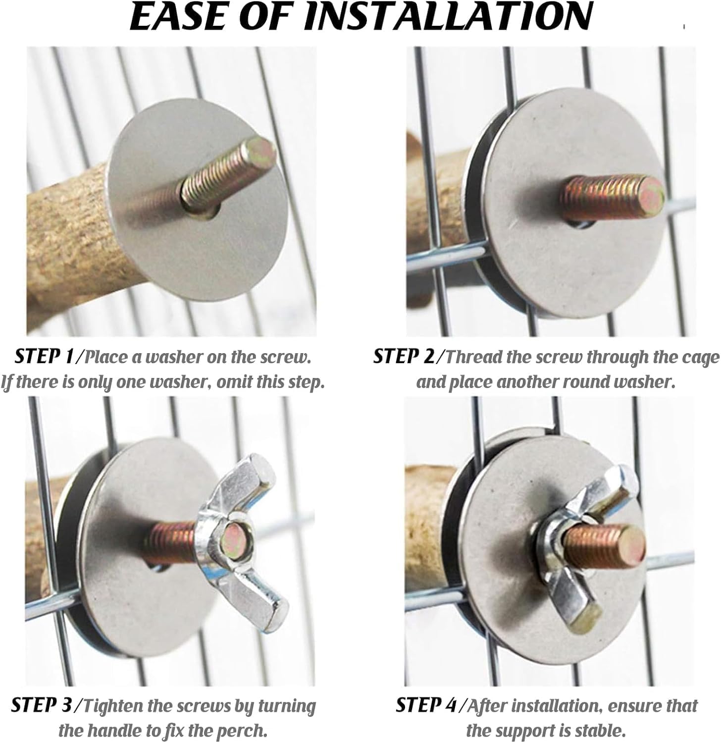 - [Simple Installation]: Each cockatiel perch is equipped with a metal wing nut and built-in bolts, just clip the bracket or platform to the bird cage with two pieces of metal washers and tighten them with screws to fix the bracket and platform stably to the bird cage, no other tools are needed