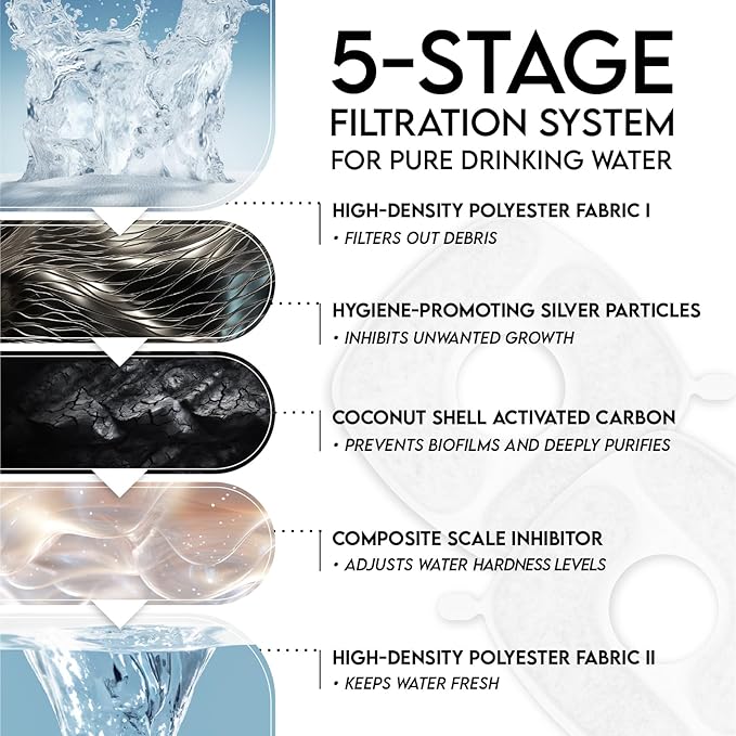 - Advanced 5-Stage Filtration. Our upgraded system with silver, scale inhibitors, and activated carbon delivers fresh, clean water for up to 3 weeks. For optimal performance and your pet’s health, we recommend using softened or filtered water.