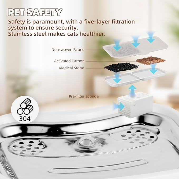 - SEPARATION OF WATER AND ELECTRIC: This cat water fountain with a water-power separation design, safety is ensured! Unlike traditional rechargeable or wired water dispensers, our water fountain for pets uses electromagnetic induction to power the pump, completely eliminating the risk of electrical charge in the water, ensuring no harm comes to your pets while they drink