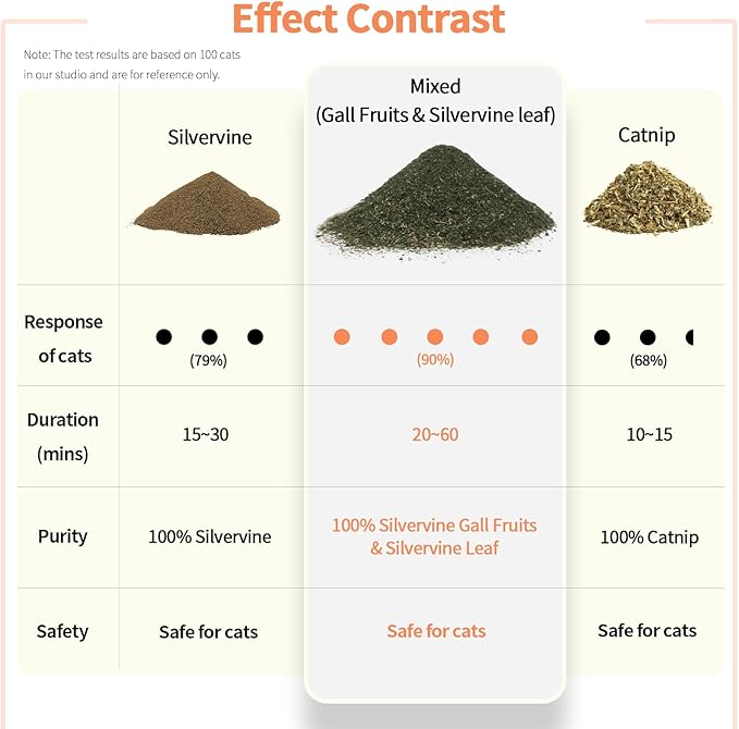 - 90% Cat Approval Rate: Our unique recipe is a blend of silvervine leaves and gall fruit. Its fine grind ensures every sprinkle releases maximum allure
