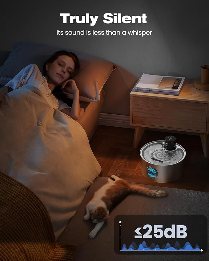 - Silent and Easy Cleaning: Operating at ≤25dB, stainless steel wireless pet water fountain won't disturb daily life. All parts are easily disassembled for cleaning. It is convenient for you to clean and maintain regularly. Note: Do not rinse/immerse the master control module.