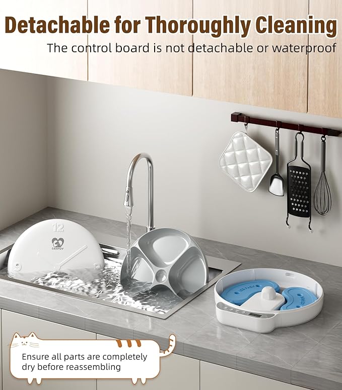 - User-Friendly and Stress-Free Feeding: With a 12H/24H toggle option, an easy-to-read LCD display, and an intuitive control panel, the Casfuy cat feeder automatic makes scheduling meals a breeze. It fits your pet's feeding schedule or helps create a healthy eating routine. Say goodbye to early wake-up calls and worries when you're working late, out on a date, or dealing with a fast eater!