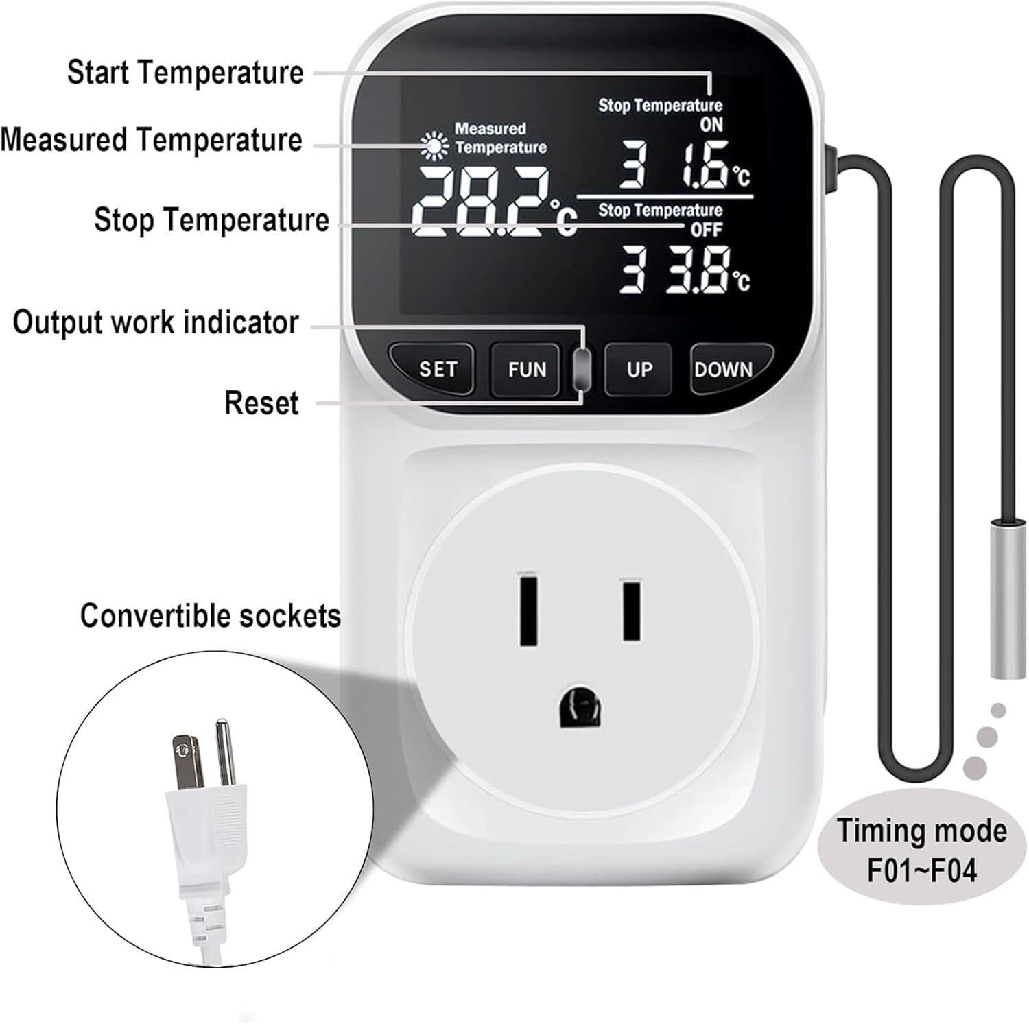 - SPECIFICATIONS: The temperature range is -40℃ to 120℃ (-104℉~210℉), the display accuracy is 0.1℃, and the measurement accuracy is +/-1%. The timer accuracy is up to one minute. The digital temperature socket works at 110VAC, the maximum operating current is 15A, and supports a load capacity of up to 1800W.
