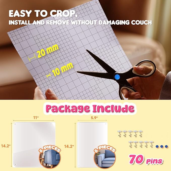 - Furniture Protector : The single-sided sticky sheets anti scratch furniture protectors discourage cats from scratching the couch. Includes 8Pcs(14.5 inch * 11.5 inch) & 8Pcs(14.5 inch * 6 inch)