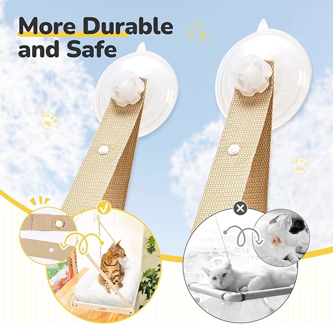 - 【Upgraded Suction Cups】Our cat window hammocks feature high quality spiral suckers with a diameter of 8.5cm/3.35",stronger and longer lasting suction, and load capacity of up to 40lbs. When you install the top two suckers, press them firmly against the glass and tighten clockwise.Make sure the sucker is firmly attached to the contact surface