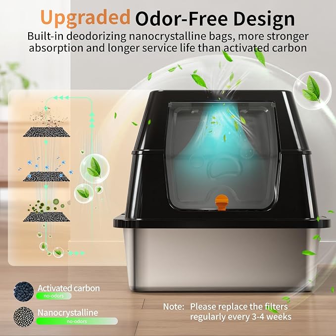 - 【Upgraded Odorless Design】The extra large litter box features a deodorizing box for placing nanocrystalline bags to absorb smells quickly, more stronger absorbption and longer service life than activated carbon, ensuring your pet and family with pure and healthy life.