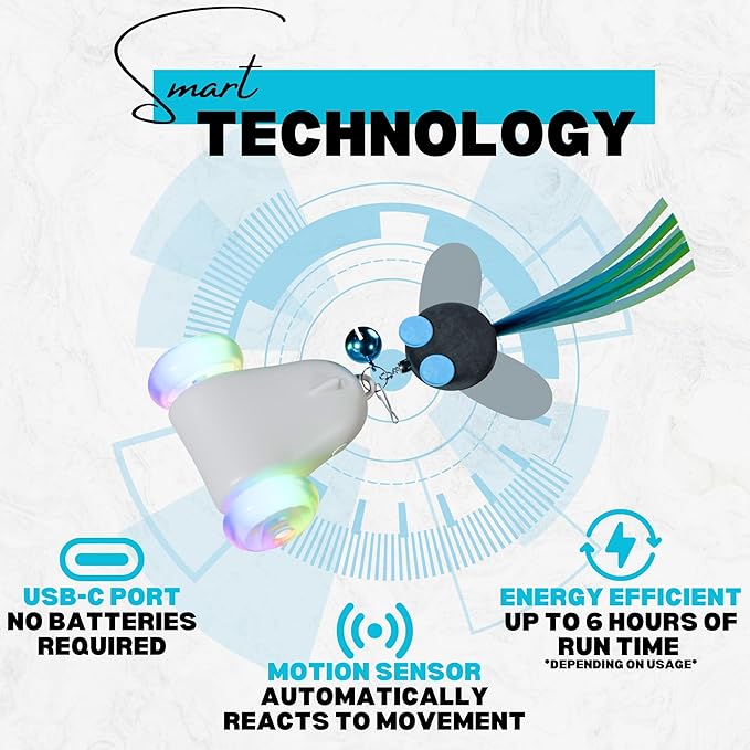 - Smart Technology: This interactive cat toy features automatic and unpredictable movement—forward/backward, left/right, flips, and 360-degree spins—along with a smart motion sensor that reacts to movement and automatically goes into standby mode to conserve battery life