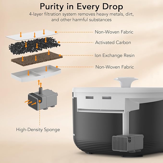- 【Advanced 5-Stage Filtration】: Our fountain features a 5-stage filtration system with upgraded materials, including lon Exchange Resin and activated carbon. This combination ensures your pet has fresh and pure water for up to 4 weeks
