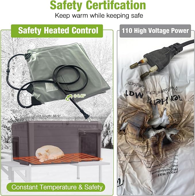 - Safe Heating System: UL tested heating pad with automatic heated control, temperature from 89 to 116°F. Build in high-temperature protection device preventing overheating or chilling. 6.5 ft chew-resistant cord adds an extra layer of safety