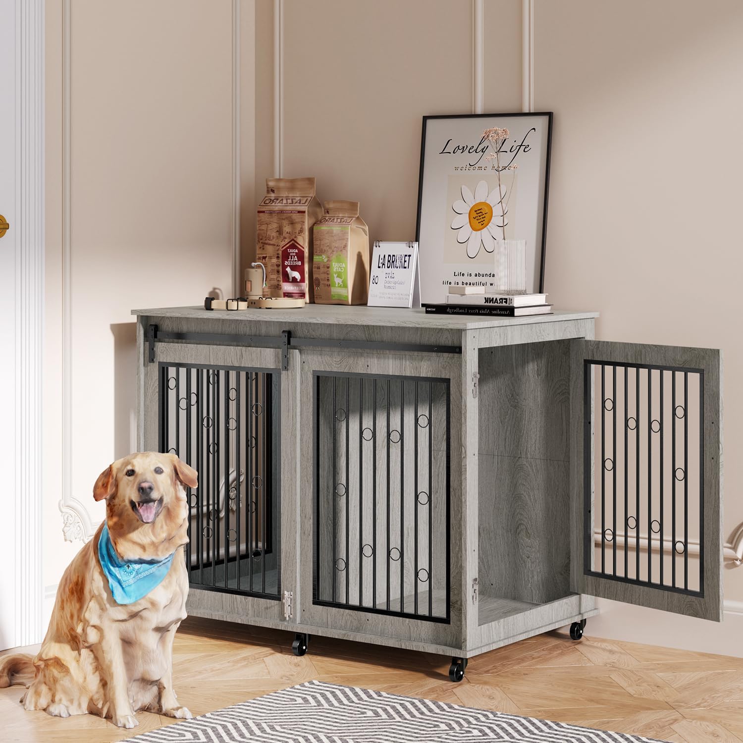 IchbinGo Large Dog Crate Furniture, 47" Wooden Dog Kennel with Sliding Barn Door, Flip-Top Lid & Wheels, Indoor Pet Crate Table with Detachable Divider for Small/Medium/Large Dogs (Rustic Grey)
