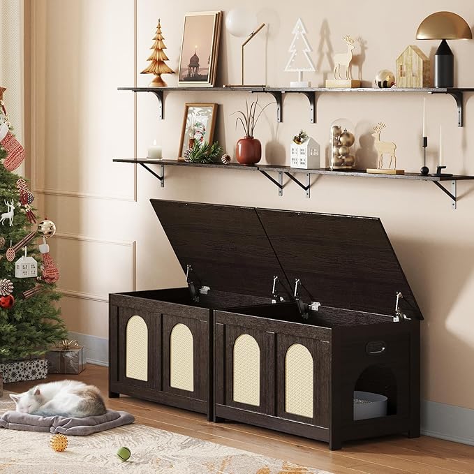 - 【Everyone Benefits】The litter box enclosure effectively contains scattered litter while acting as a protective barrier to minimize odor spread into living area. Its top-opening lid ensures effortless daily cleaning and cat care – ideal for elderly users or those with limited mobility (e.g., back/leg issues)
