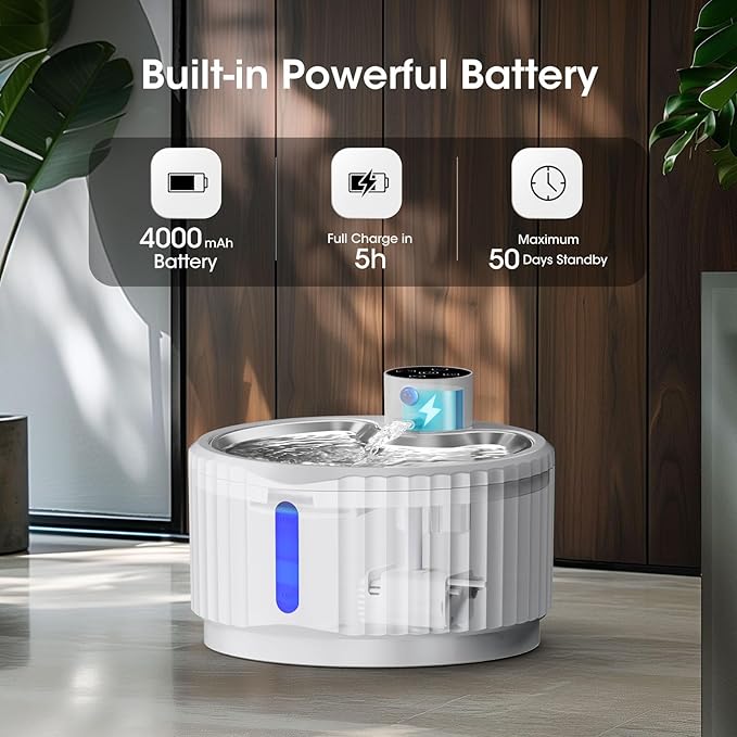 - Maximum 50 Days Standby: No worries about power outage! This battery operated cat water fountain has a built-in 4000 mAh rechargeable battery, after a full charge in about 4-5 hours, it can work continuously for 50 days (timing mode or induction mode)