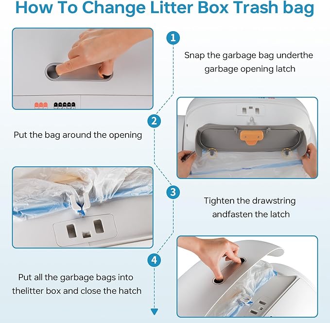 - 【After-sales guarantee】The product includes:① SUW self cleaning litter box *1② 17.8x17.8 inch standard drawstring litter bags *60③ 110-220V power adapter *1④ Manual *1⑤ Two month warranty. If you encounter any issues, please don't hesitate to contact us