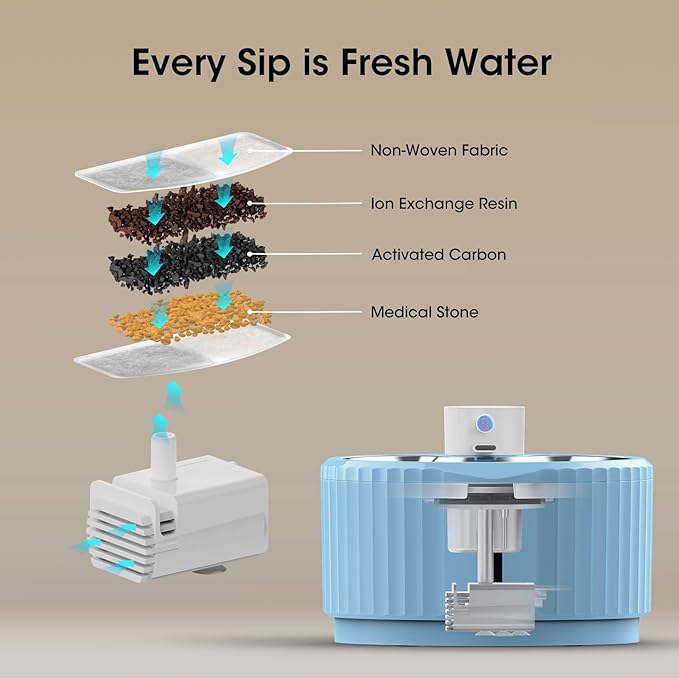 - Every Sip is Fresh Water: 1.Activated carbon removes bad taste and odor 2.Ion exchange resin could soften the tap water 3.Medical stone removes heavy metals and releases trace elements 4.Non-woven fabric could filter hair and impurities 5.The high-density sponge of pump helps remove fine particles. Purifying water quality, pets can drink water without worry