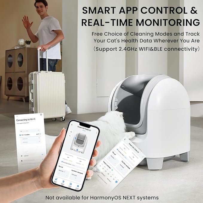 - Remote Health Monitoring via App: With 2.4G connectivity, the secure app lets you track your cat's bathroom habits, usage times, and monitor their health. You'll receive real-time alerts for issues like low litter levels or malfunctions. Note: The APP does not support the latest HarmonyOS NEXT at this time. We apologize for this and will keep you informed of any updates