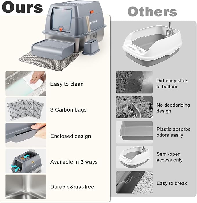 - 🌬️ Efficient Double Odor Control System:The XL litter Box features a fully enclosed airy design,effectively preventing odors from escaping.Meanwhile, 3 replaceable charcoal bags can absorb and neutral odors, keeps your home always fresh.Perfect for unventilated rooms.