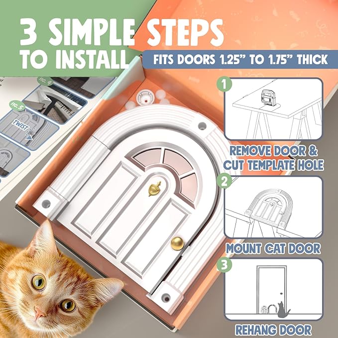 - EASY DIY INSTALLATION - Most cat doors on the market are put up with flimsy tape. DIYers can set up this pet door for interior doors in minutes. Our patented indoor cat door comes with easy to follow instructions and sturdy screws for a more secure, foolproof installation. Conveniently fits both solid and hollow core doors.