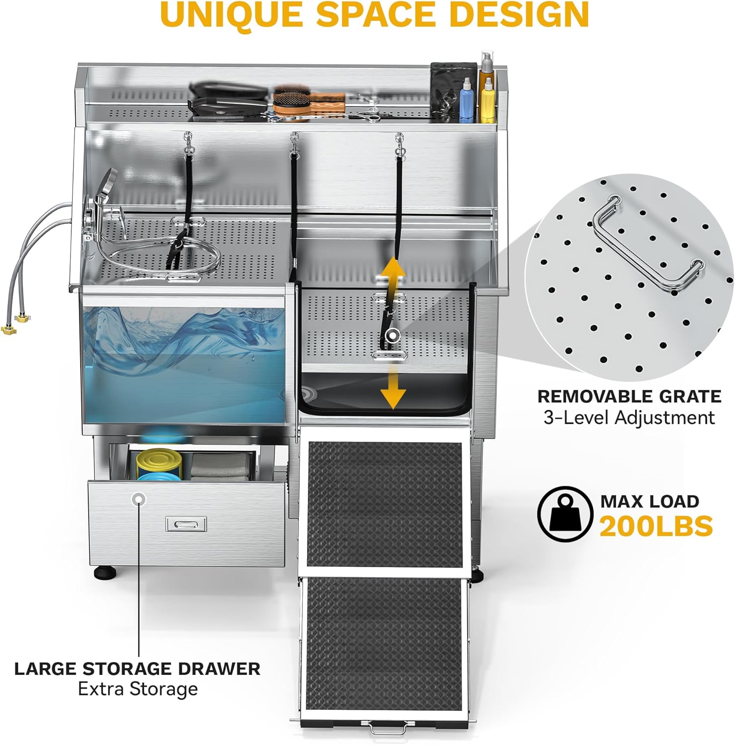- Easy Entry: The foldable, slide-out ramp of our pet washing station also be used as a secure door, enhancing pet safety; It comes with a 3-tier, 2-piece adjustable grate that can hold up to 200lb, facilitating pet entry and exit