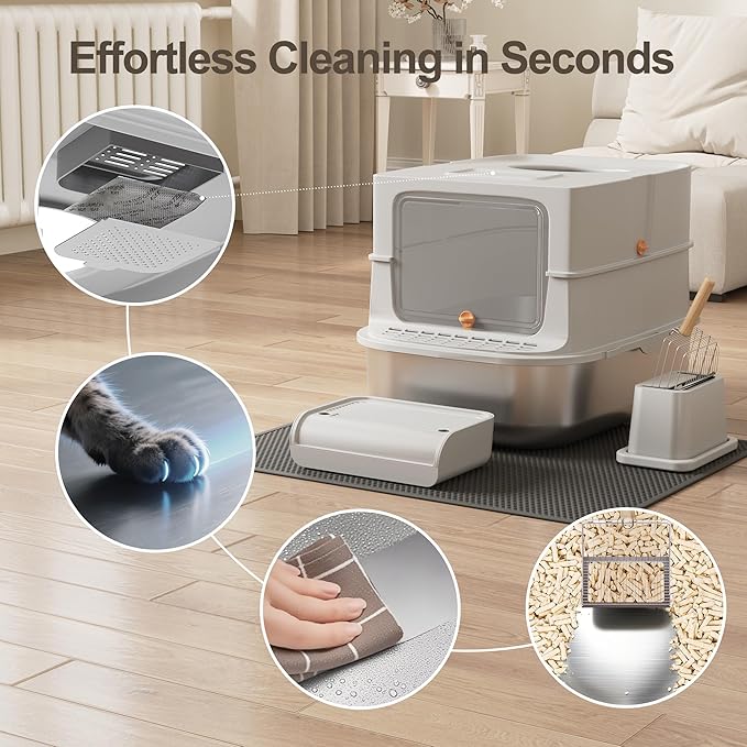 - 😽💟【Dual Entry Option】This stainless steel litter box with lid has top & front entries with steps for all cats. The top has litter-trapping holes, and its 3-part design works as a xxl cat litter box or semi-open setup for easy cleaning. This cat litter box enclosure is both functional and versatile.