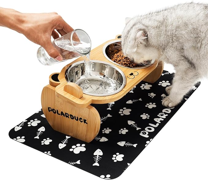 - Raised Food Bowls to Improve Pet's Health: Polarduck elevated cat food bowl with 15° tilted design provides an comfortable position for your pet to eat. It also helps to reduce neck and back strain for pets when feeding, and lower the risk of choking or vomiting, protect the health of your pet. Recommended essentials kit for cat and puppy.