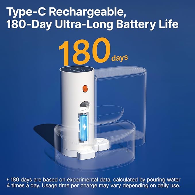 - Cordless Convenience with 180-Day Battery Life - Powered by a Type-C rechargeable battery, this cordless water fountain offers up to 180 days of operation per charge. Flexibly place it in any room—be it the living room, bedroom, or balcony.