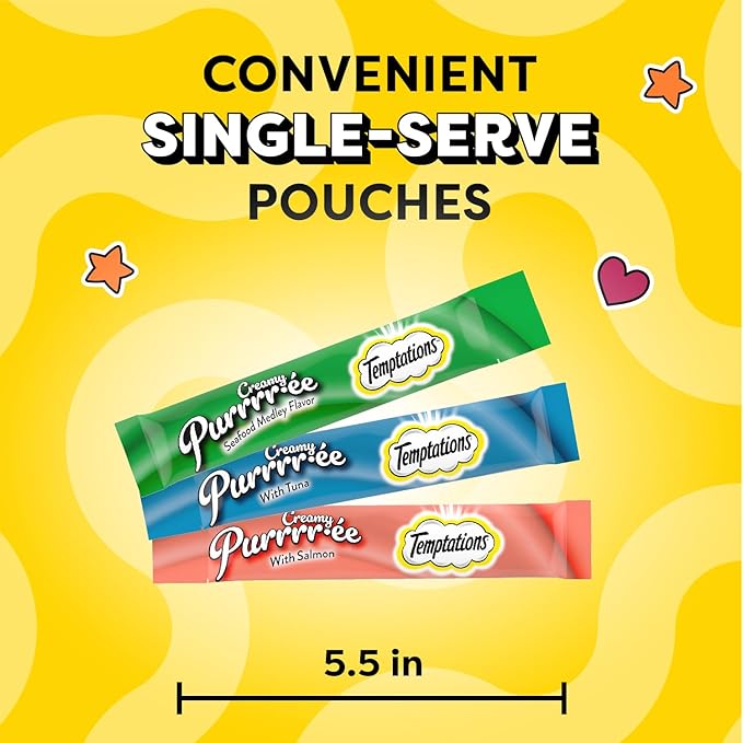 Temptations Creamy Puree Mix-Ups Squeezable Lickable Wet Cat Treats, Tuna Flavor, Salmon Flavor, and Seafood Medley Flavor, 0.42 oz. Tubes, 24 Count
