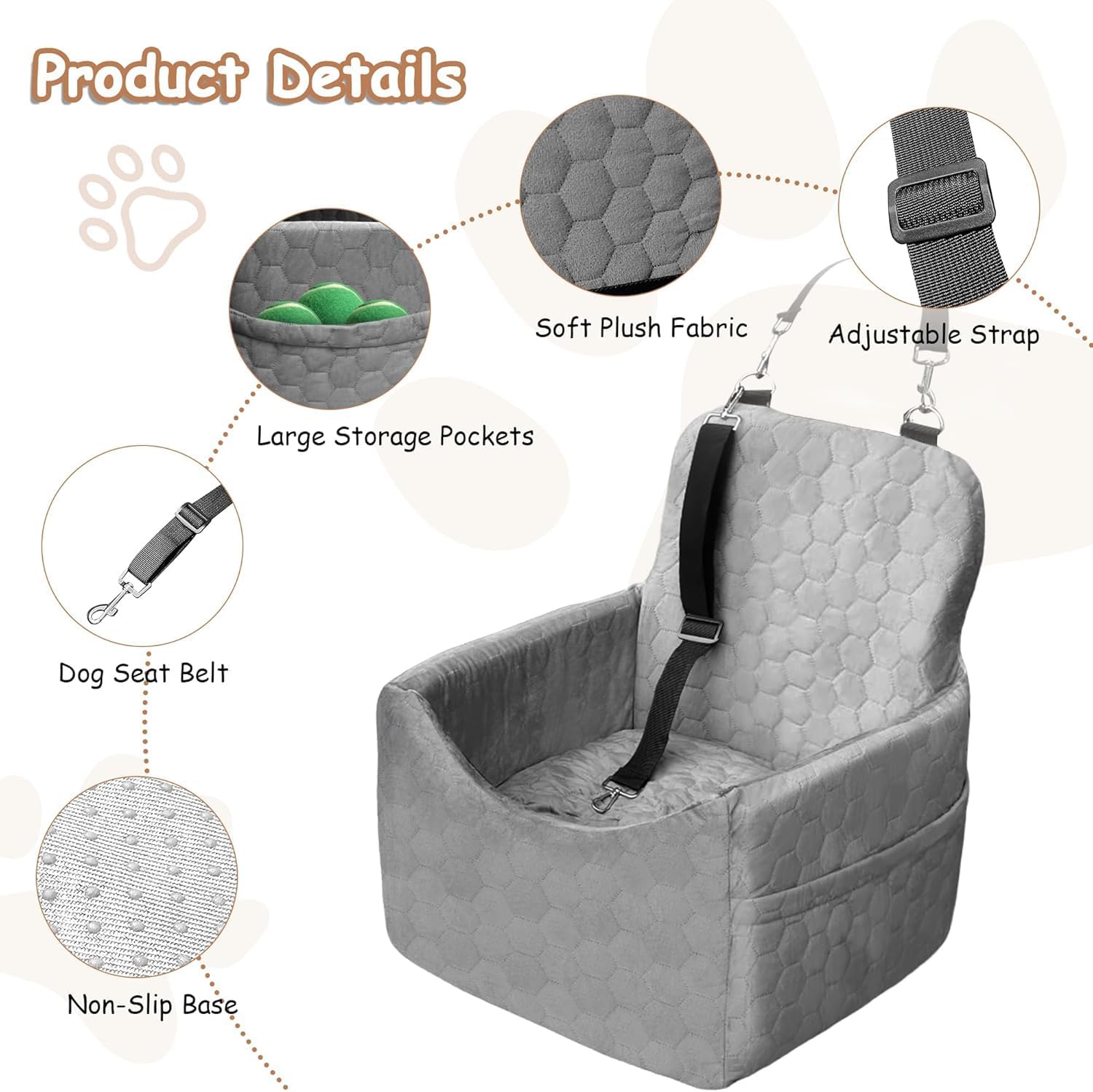 Dog Car Seat for Small/Medium Dogs - Dog Booster Seat with Safety Straps & Non-Slip Base, Travel Pet Car Seat with Storage Pockets, Washable & Removable, Suitable for Dogs Under 35 lbs (Gray)