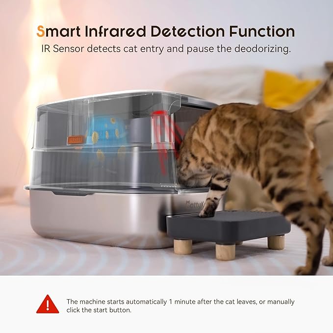 - 【Odor Control】Odor Control stainless cat litter box features plasma generator that eliminate odors.This stainless steel litter box with lid can adjusts deodorization intensity (Mode 1 for single-cat homes, Mode 2 for two cats, Mode 3 for 3+ cats), ensuring 90% odor elimination.