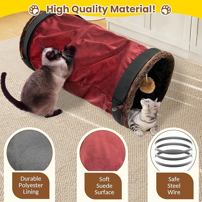 - 4. SAFE MATERIAL: The lining is made of durable, scratch-resistant polyester fabric, and the surface is soft, warm suede. A flexible steel wire frame supports the tunnel and is not easy to deform.