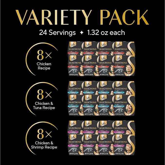 Sheba Selections Filets in Broth Adult Wet Cat Meal Complement Chicken, Tuna, or Shrimp Recipe, 1.3 oz. Cups, 24 Count