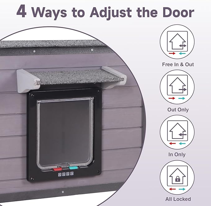 - 【Multi-functional Door Lock】This insulated cat house outdoor winter has a brand new locking mechanism with four customizable settings. You can freely configure the pet's access mode to suit your needs, effectively preventing unwanted escapes and ensuring your pet stays securely within its designated area.The cat can see the beautiful outdoor scenery through the glass.